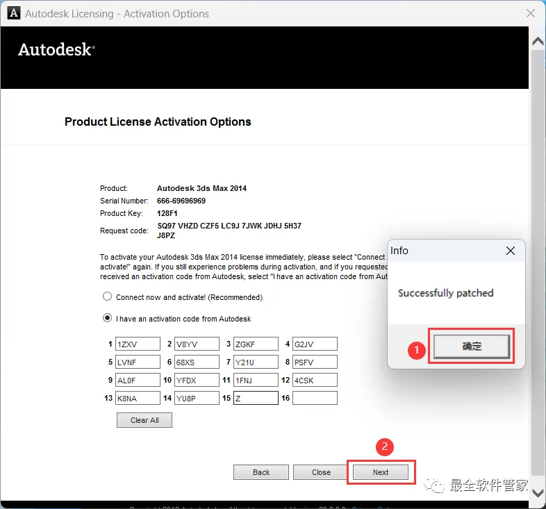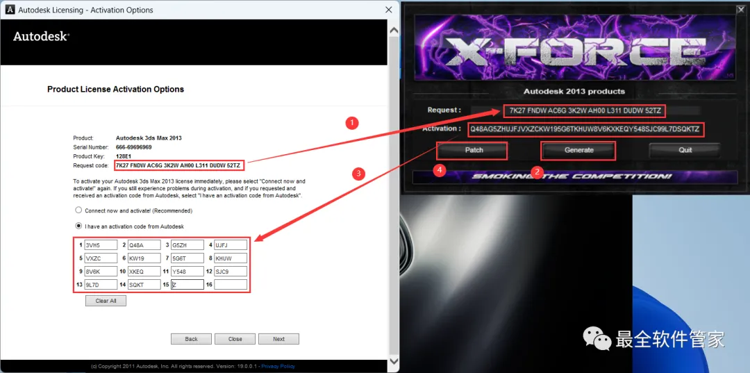 19、打开软件界面,将软件的【Request code】填入到程序的【Requset】内,再点击【Generate】,将程序的【Activation】填入到软件的【I have an…】内,再点击【Patch】