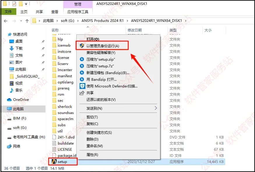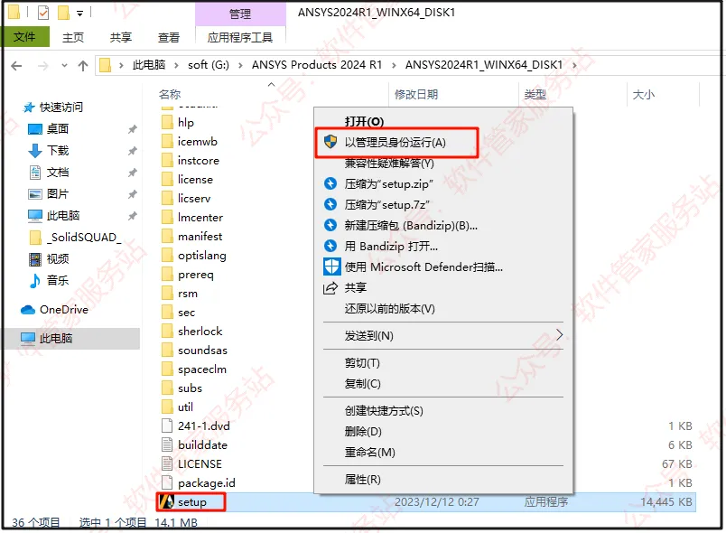 第二十九步:再次打开解压后的【ANSYS2024R1_WINX64_DISK1】文件夹,找到【setup】安装程序,右击【以管理员身份运行】。
