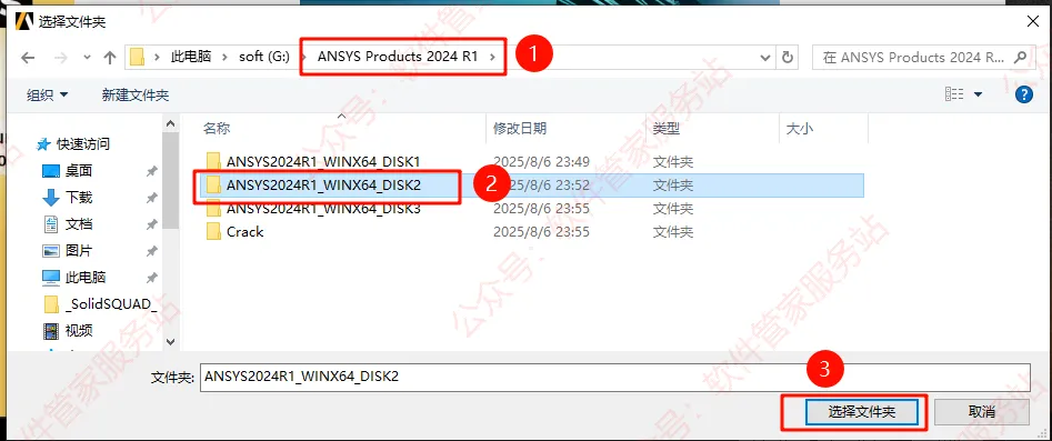 第三十九步:选择第二步解压的文件夹中的【ANSYS2024R1_WINX64_DISK2】文件夹,然后点【选择文件夹】。