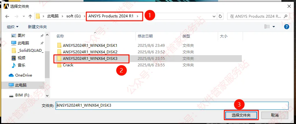 第四十三步:选择第二步解压的文件夹中的【ANSYS2024R1_WINX64_DISK3】文件夹,然后点【选择文件夹】。