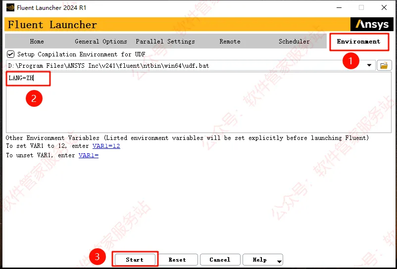 2.选择【Environment】,输入【LANG=ZH】,然后点【Start】。