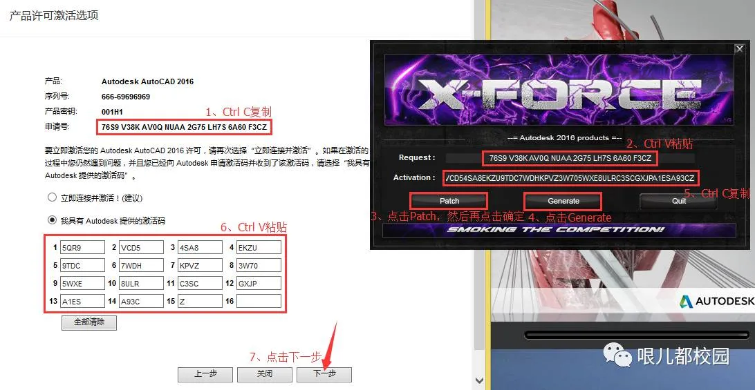 14.把申请号“Ctrl C”复制,“Ctrl V”粘贴到注册机里面的Request,先点击“Patch”,再点击“Generate”,然后“Ctrl C”复制激活码,然后再“Ctrl V”粘贴激活码,最后点击“下一步”即可。