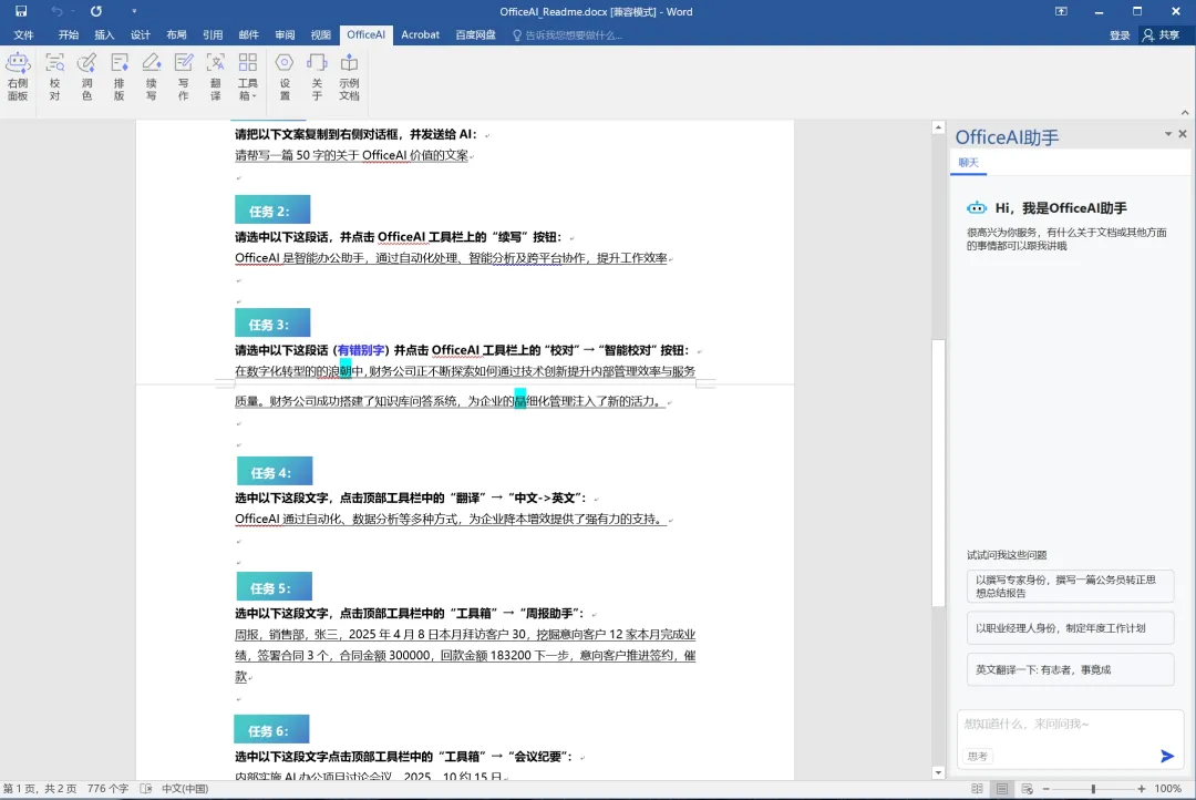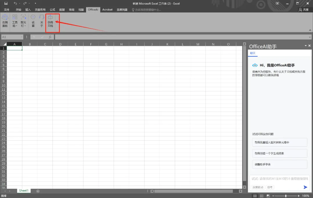 篇幅有限,具体功能不再展示,可以直接点击officeAI菜单,点击工具栏最右侧的“示例文档”按钮,查看具体功能怎么操作。