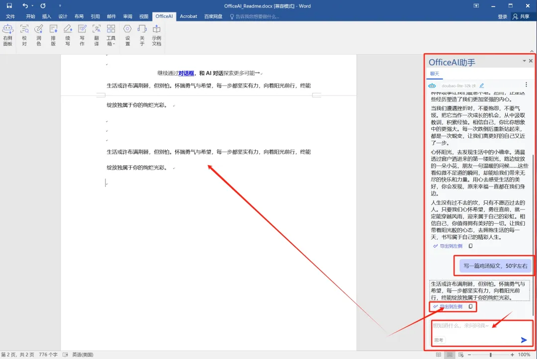 2.写作功能:利用officeAI助手写一些小短文什么的,如果写的满意,可以直接点击短文下面的“导出到左侧”蓝色按钮,直接导入到Word中。
