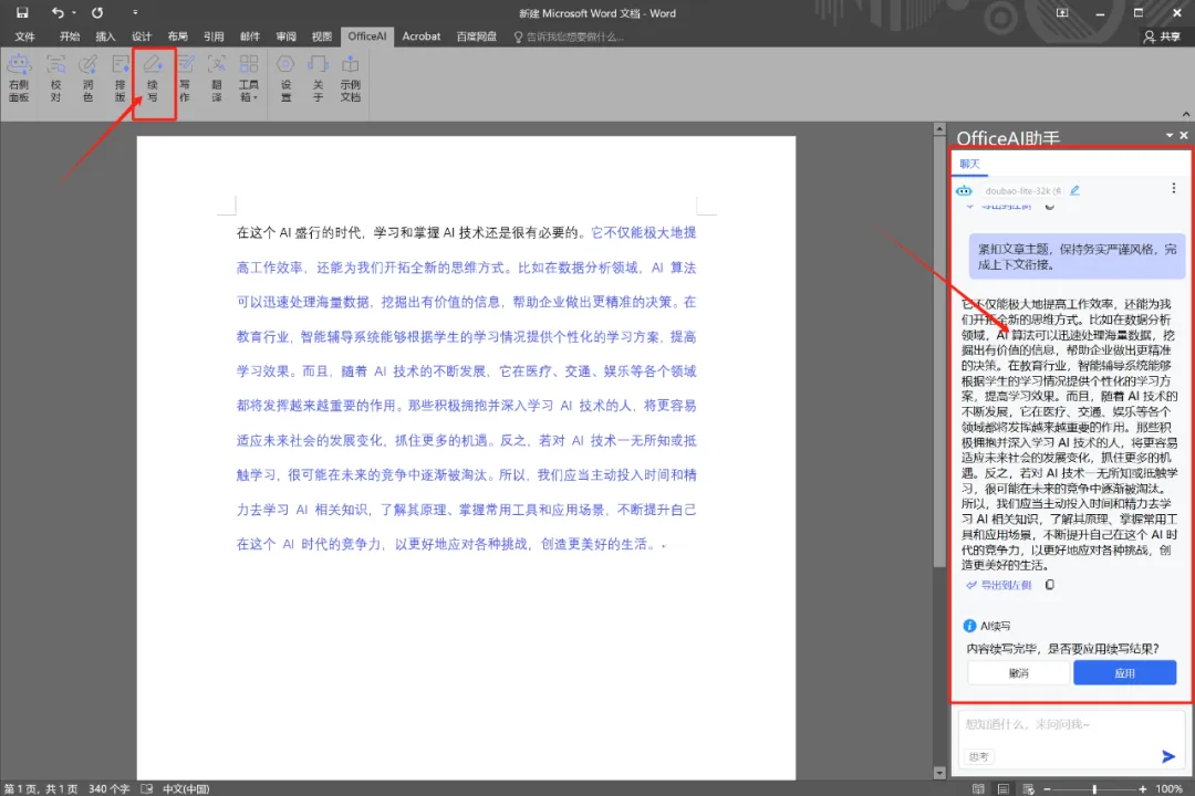 3.续写功能:写文章写了开头,接下来毫无头绪?不知道怎么写了?利用小助手的续写功能轻松帮你完成。选中你要续写的句子,点击工具栏的“续写”按钮即可,如果效果满意,可以直接点击应用按钮即可。(下图黑色字体为小编写的开头,蓝色字体为AI助手续写内容)officeAI不仅提供续写功能,还提供“润色”功能,选中文字内容,点击润色按钮即可。