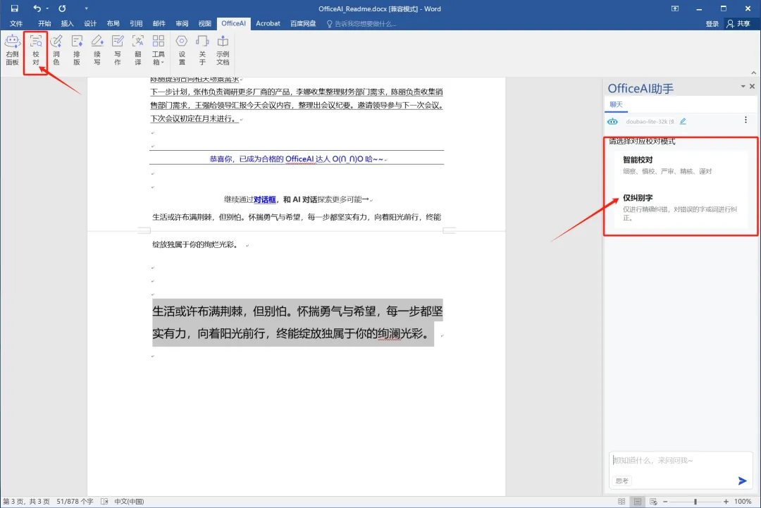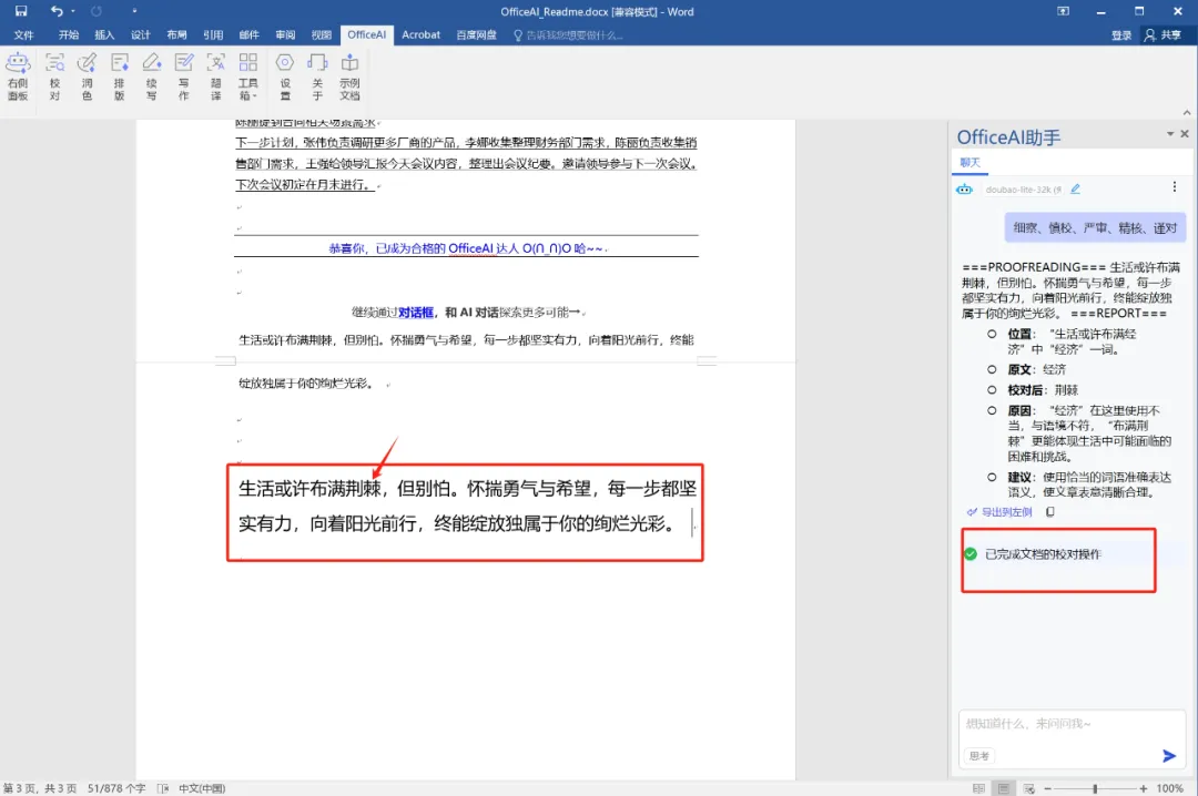 错别字校对示例:错别字以红字显示,觉得改的正确点接受即可全部自动更改错别字。