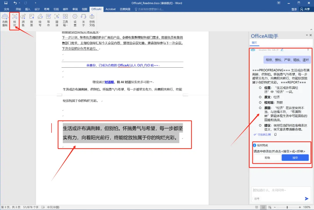 如果觉得校对的满意,可以直接点击下方的“接受”按钮即可直接应用到Word文章中。