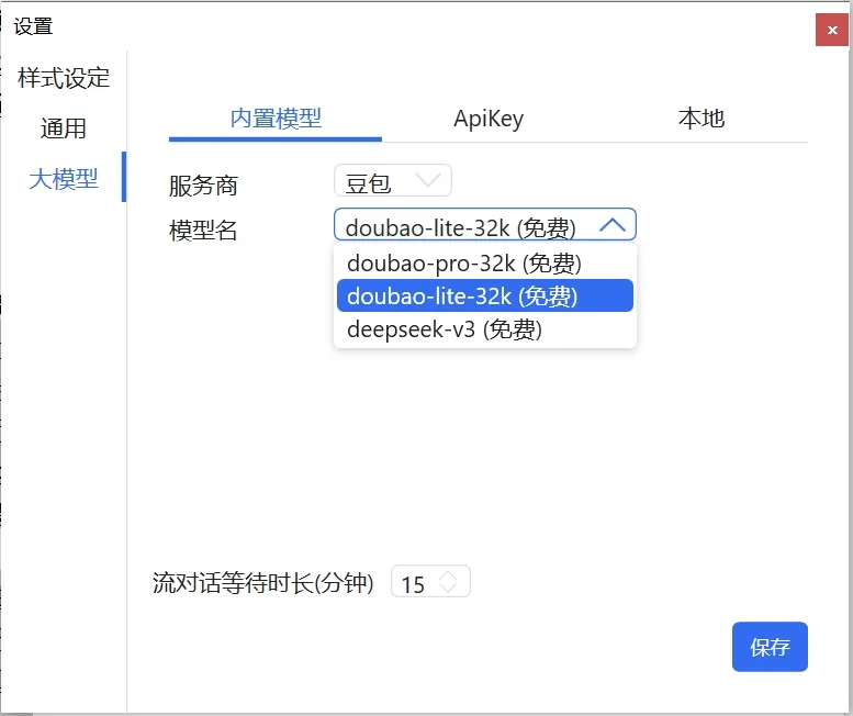 8.AI大模型设置:可选豆包、DeepSeek等,也可以自己申请免费API接入或者选择本地模型接入自己的私有大模型。