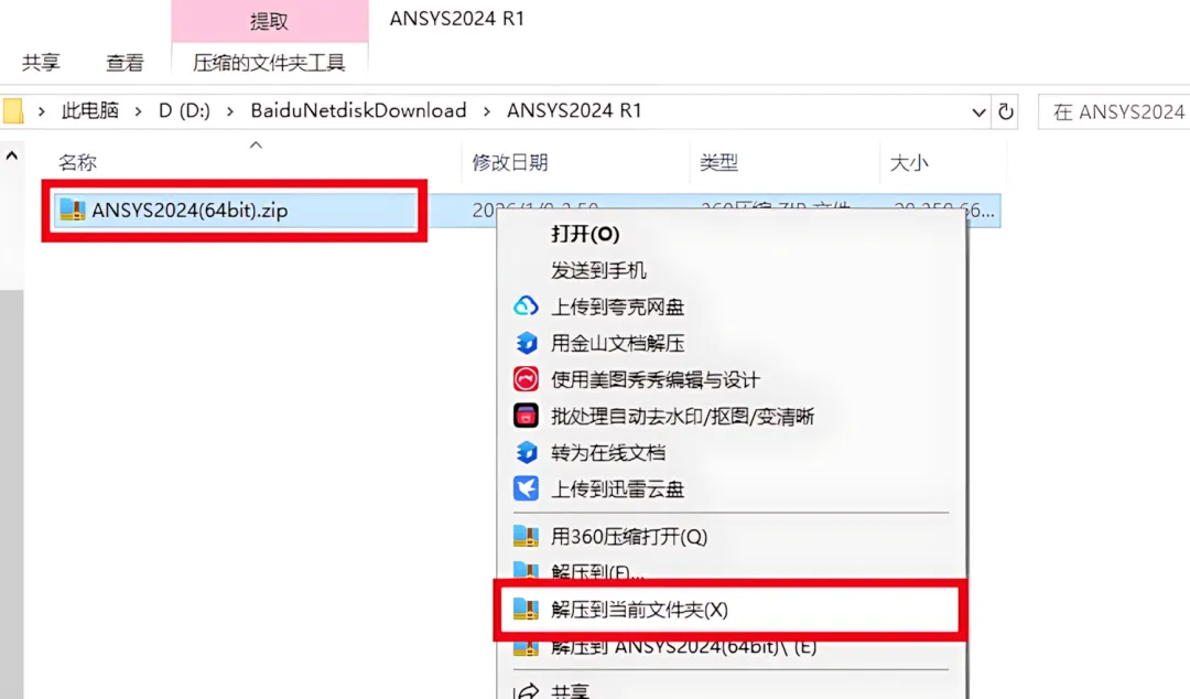 1.下载ANSYS2024(64bit)软件安装包到电脑上,右键选择【解压到当前文件夹】。