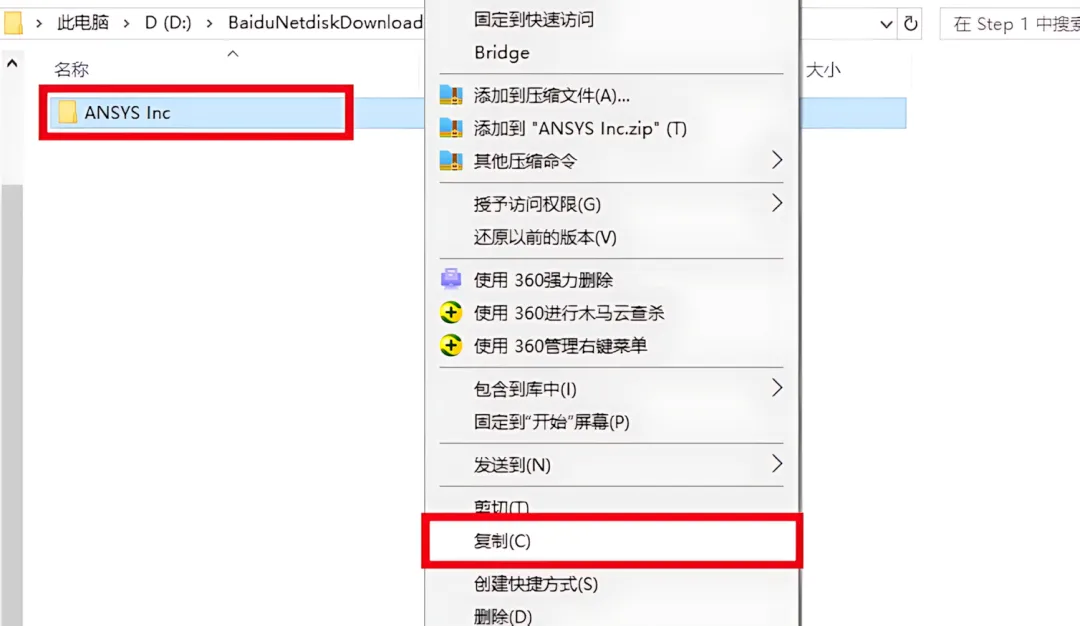 44.鼠标右击【ANSYS Inc】文件夹选择【复制】。