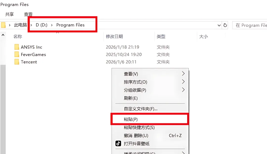 17.打开路径【D:\Program Files】(步骤7修改后的路径),鼠标右击空白处选择【粘贴】。