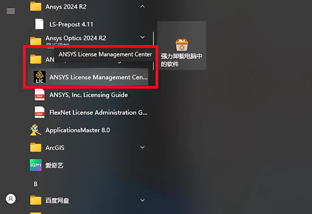 19.点击桌面任务栏中的【开始图标】>点击【所有应用】>双击展开【ANSYS,Inc……】文件夹,点击【ANSYS License ……】。