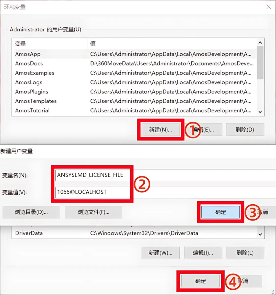 50.①点击用户变量下的【新建】②输入变量名【ANSYSLMD_LICENSE_FILE】和变量值【1055@LOCALHOST】③点击【确定】④点击【确定】。