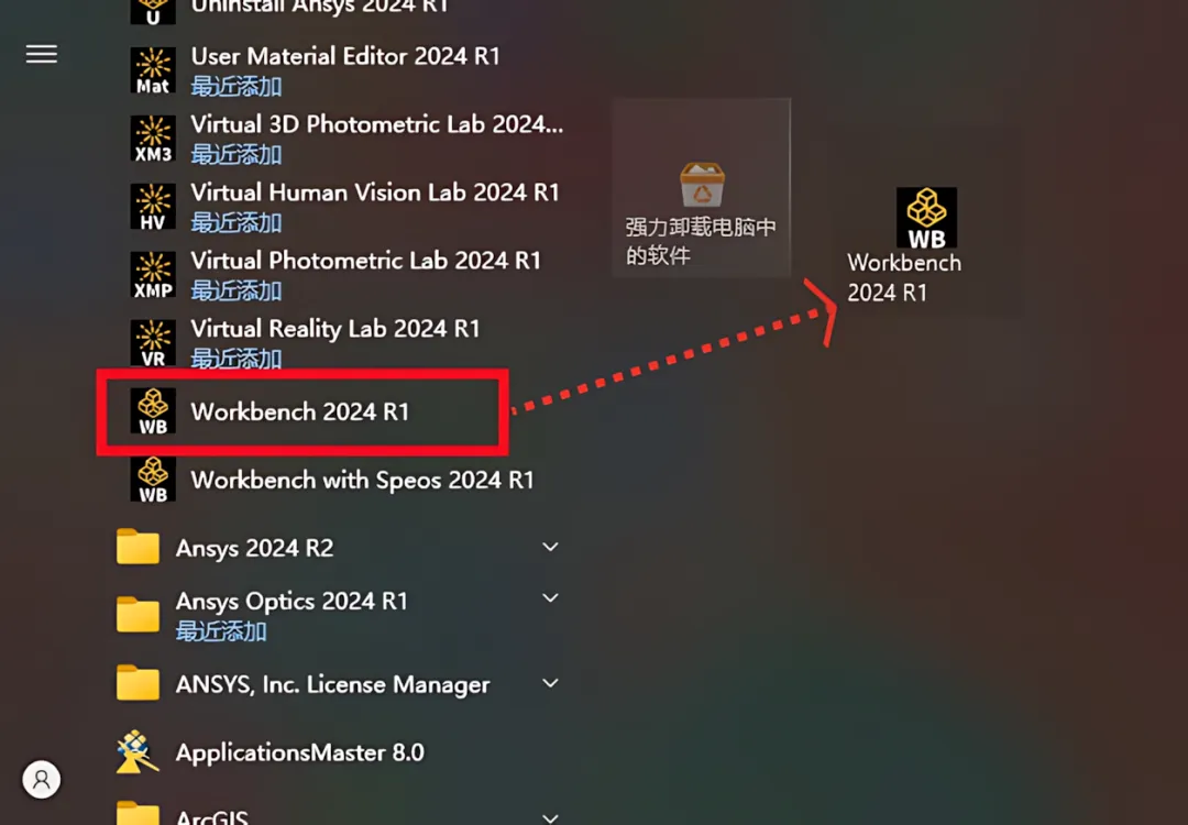 52.点击桌面任务栏中的【开始图标】>点击【所有应用】>双击展开【ANSYS 2024R1】文件夹,拖动需要启动的ANSYS产品(如:Workbench】到桌面完成快捷方式的创建。