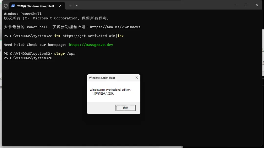 然后输入以下代码: irm https://get.activated.win|iex,敲回车执行