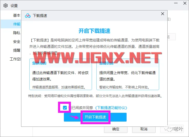 2、√上【我已阅读并同意《下载提速功能协议》】—【开启下载加速】,如下图所示: