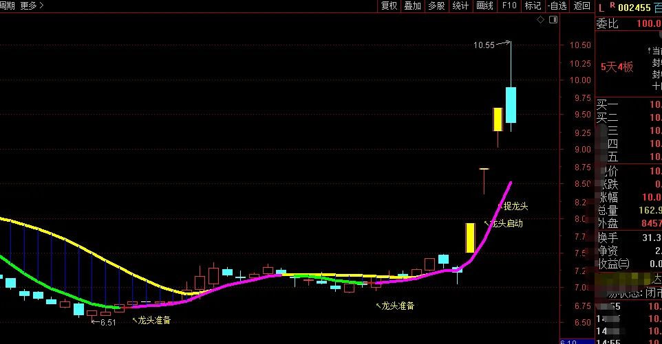 DRAWTEXT(ZG17 AND ZG23>0,L*0.95,’↖龙头启动 ‘),COLORYELLOW ,LINETHICK2;