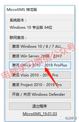 4、点击激活Office2010-2019proplus。(这个激活工具可以激活不同版本的office,还可以激活其他办公软件和windows系统,也可以一键关闭Windows10的安全软件Windows Defender,可以说是一个万能的工具了)