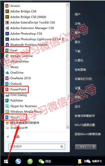 1、在开始菜单找word、excel、powerpoint等,随便打开一个,电脑学习小编这里就打开word吧。注意windows10开始菜单安装的软件不会在一起的。要想让他们在桌面上显示,只要右击发送到桌面快捷方式即可。