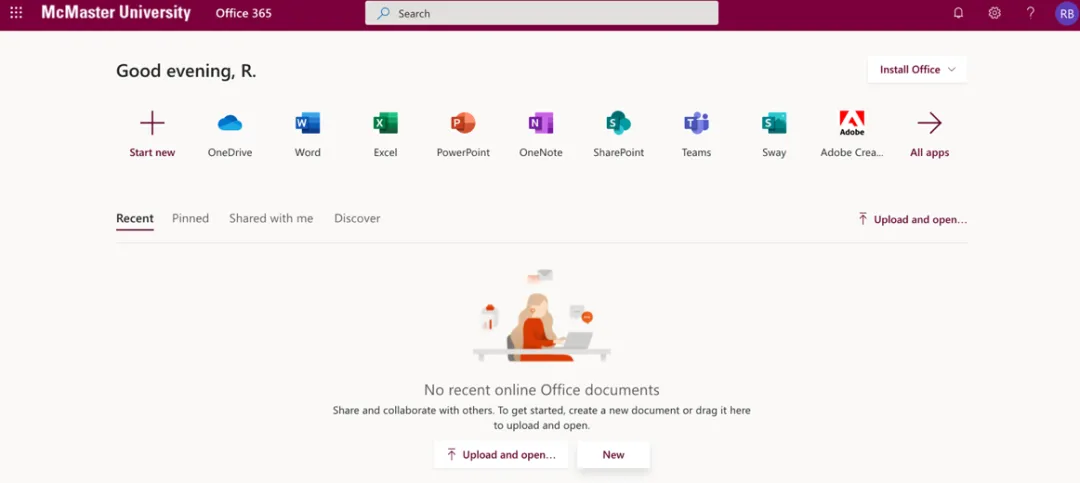 首先,在浏览器里使用麦马用户名&密码登录Office 365后可以看到有一个New的选项。