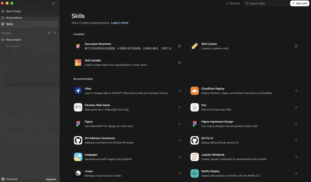 Codex App很重视这个,比Claude Code在安装、创建、使用Skills方面更加方便。