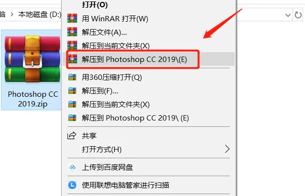 一:鼠标右键解压Photoshop CC 2019