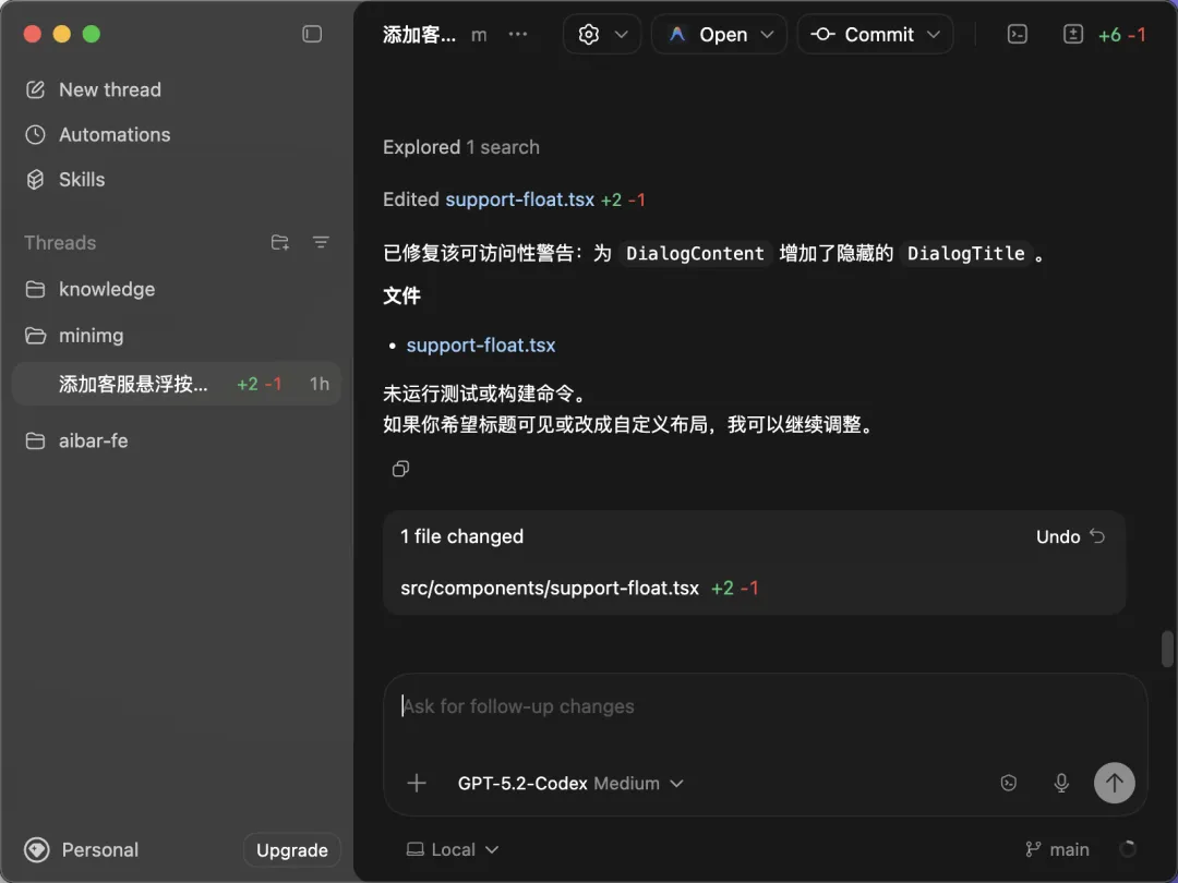 传统编辑器都是以代码为主导,所以代码编辑区域通常都非常大,方便查看和编写代码。而 Codex App 则更像一个LLM聊天客户端,只需要说清楚你的需求,剩下的就交给工具去完成。我认为这才是AI编程应该的样子,编程只是手段不是目的,IDE只是手段的其中一种工具,所以人与工具的互动应该聚焦在最终问题和需求上,不是具体的代码细节。