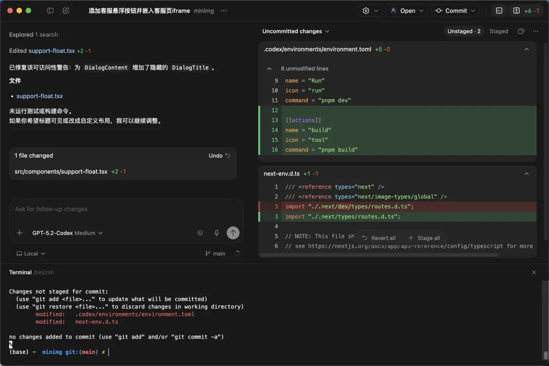 今天下载体验了一下 Codex App,并用这个工具实现和优化了一个小需求,整体体验要比传统IDE编程强很多。只需要聚焦在我想要什么,以及实际效果是否符合我的预期即可,我根本不需要看文件在哪个目录下、修改了什么,反正有错误我就抛给AI,之后就点一下 Commit 以及 Push 即可。不知道有没有人跟我一样每次写 Commit Message 都很头疼,Codex App 会根据代码变化自动生成一个合适的 message,对我来说真是一大福音。
