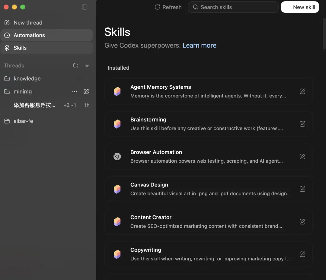 默认安装了很多 Skill,也可以根据需要添加新的 Skill,点击 “+ New skill”,不是跳转到传统的 skill 市场去搜索,而是跳转AI对话界面,并艾特了一个 Skill Creator,你只需要描述你需要什么样的 Skill,然后 Codex App 就会根据你的描述自动创建一个 Skill。