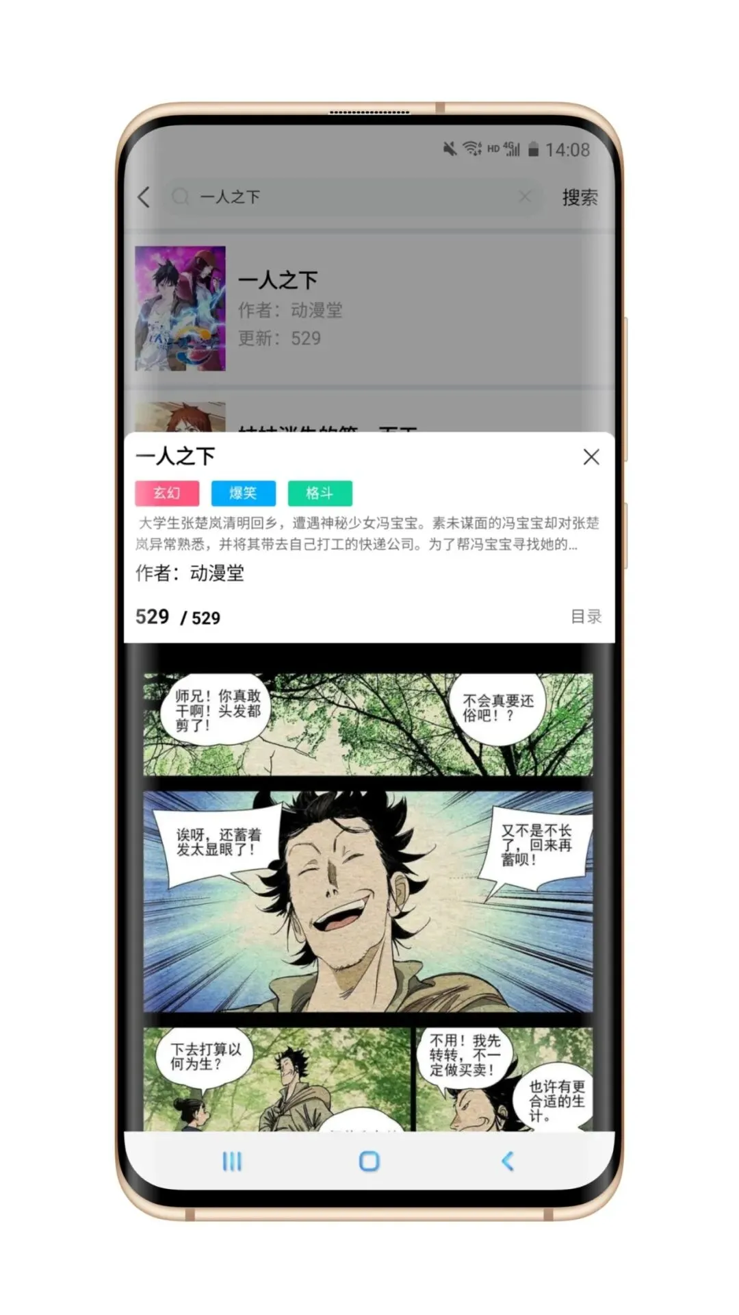 打开软件搜索想要看的漫画,往下翻一翻,就会找到你刚刚搜索的漫画~