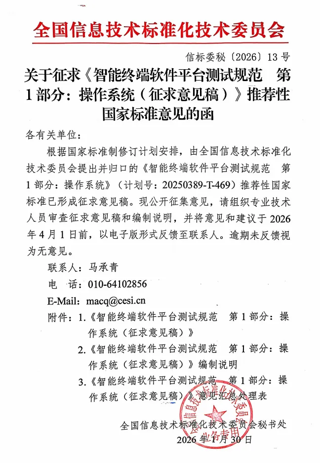 关于征求《智能终端软件平台测试规范 第1部分:操作系统(征求意见稿)》性国家标准意见的函