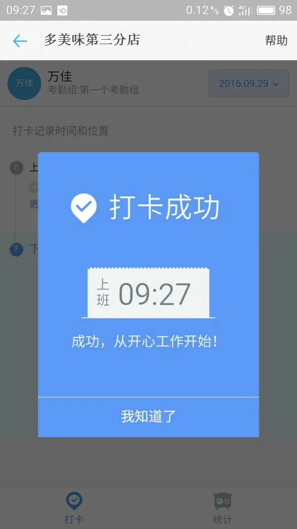 GPS定位打卡:管理员设置考勤地点后,员工在有效范围内(默认300米)点击【上班打卡】即可完成签到,系统自动记录时间与位置;