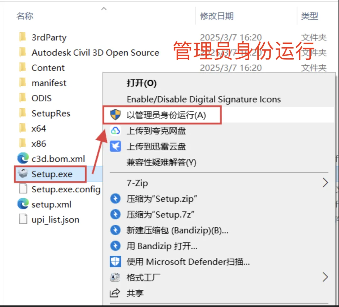 3、运行安装程序: 找到文件 Setup.exe,右键点击它,选择:以管理员身份运行。