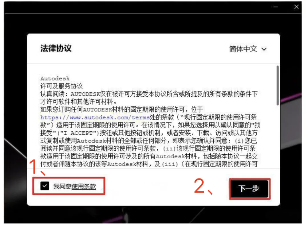 4、同意许可协议: 在安装界面中,勾选:我同意使用条款,然后点击:下一步。