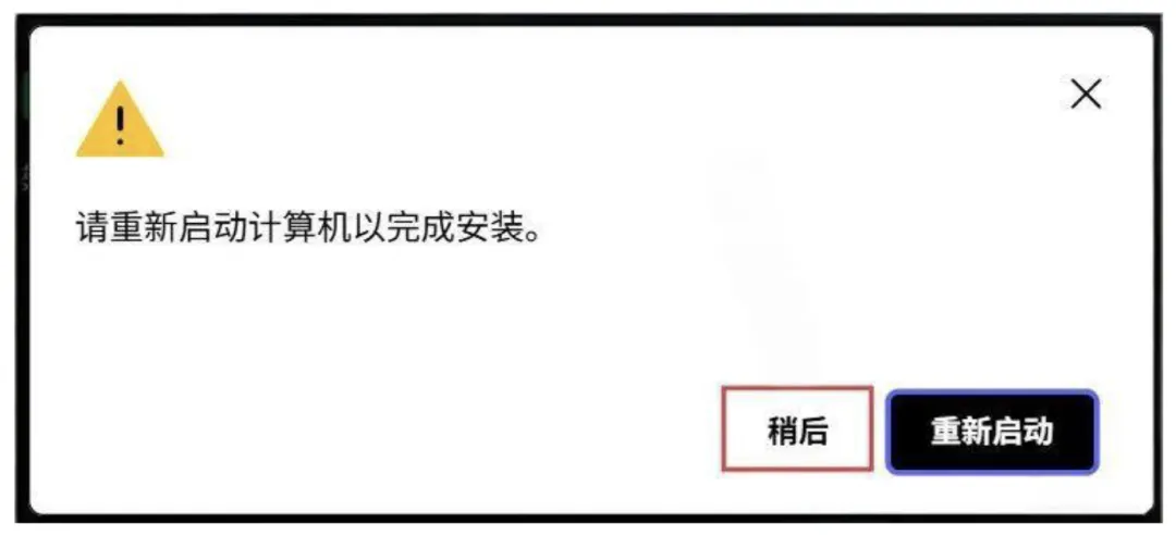 8、完成安装: 安装结束后,直接点击窗口右上角的 X 关闭。如果系统提示重启计算机,选择稍后即可。