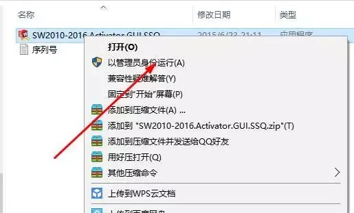 10.打开软件安装包里的破解文件夹,鼠标右击SW2010-2015.Activator.GUI.SSQ选择以管理员的身份运行