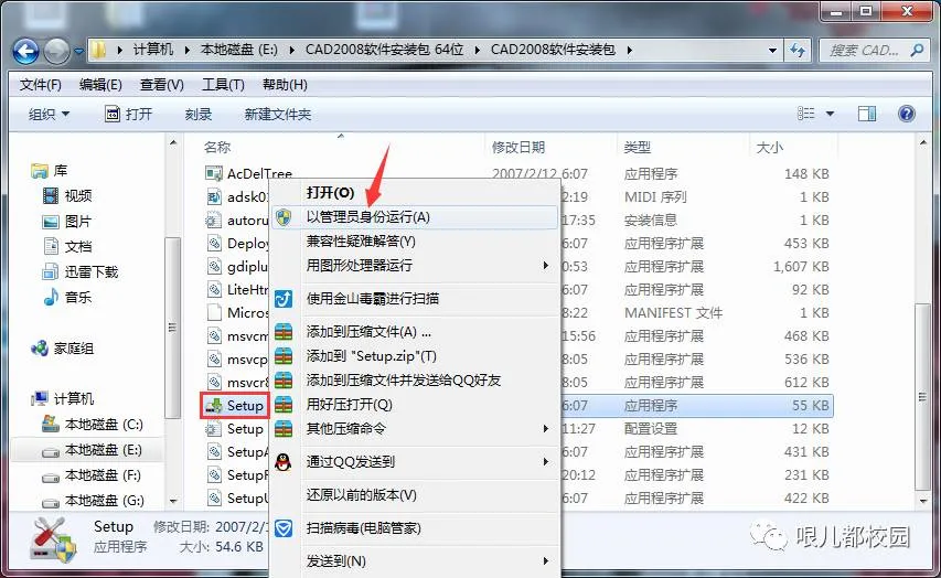 2.打开“CAD2008软件安装包 64位”文件夹,鼠标右击Setup,选择“以管理员身份运行”