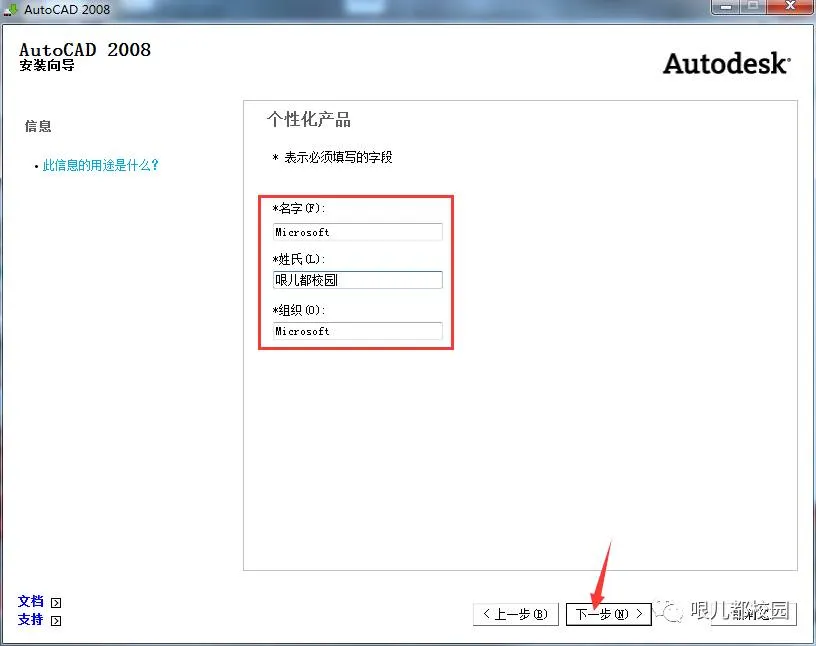 7.名字、姓氏、组织等随便输入,然后点击“下一步”