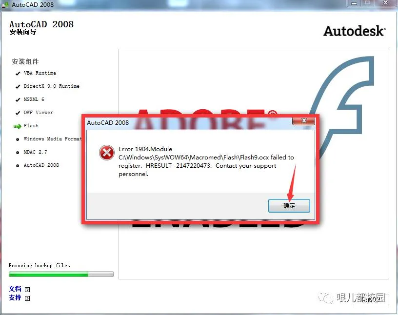10.如下图所示(弹出的这个错误提示,是正常的),点击“确定”后会自动继续安装完毕的