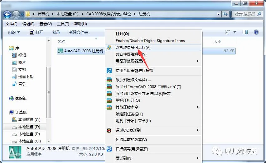 15.打开软件包里面的“注册机”文件夹,鼠标右击AutoCAD-2008 注册机,选择“以管理员身份运行”