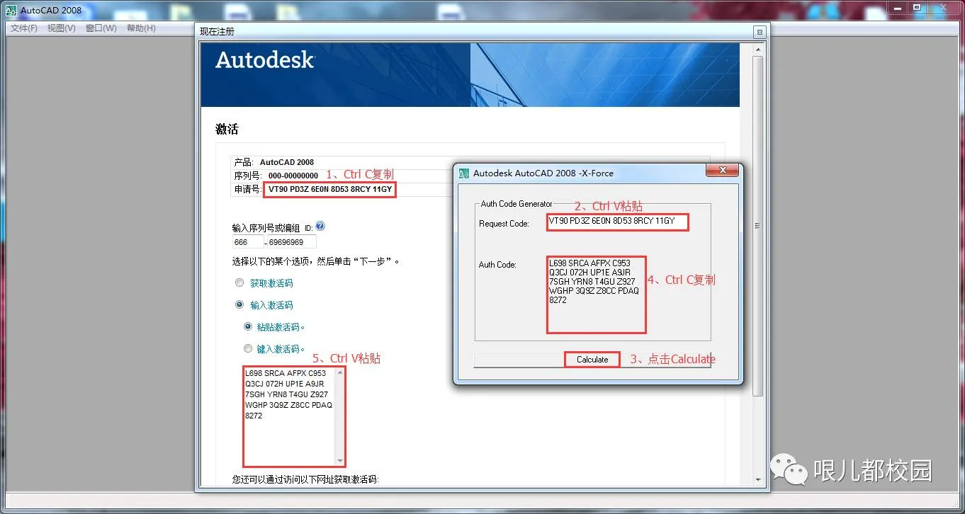 16.把申请号“Ctrl C”复制,“Ctrl V”粘贴到注册机里面的Request Code,点击“Calculate”,然后“Ctrl C”复制激活码,然后再“Ctrl V”粘贴激活码