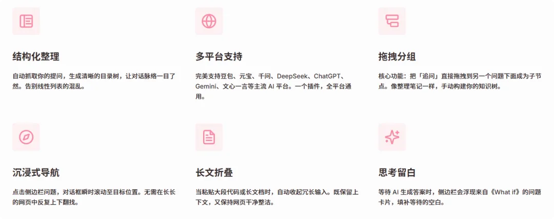 1. 自动抓取,一目了然你每问一个问题,它自动抓取成一个标题,挂在左边。 不用再在一万字的回复里找问题了,想看哪里点哪里。 页面瞬间滚动过去。 丝滑。 终于不用像个傻子一样疯狂刷滚轮了。
