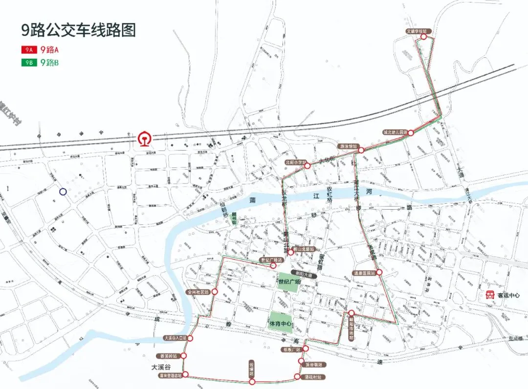 9路A线路站点(顺时针环线):世纪广场站—全兴社区站—大溪谷入口站—香溪岭站—喜来登酒店站—云缦站—蒲砚村站—溪谷嶺站—纸板厂站—朝阳市场站—通康医院站—游泳馆站—城北幼儿园站—文靖学校站—(返程经)城北幼儿园站—游泳馆站—北街小学站—鹤山北路站