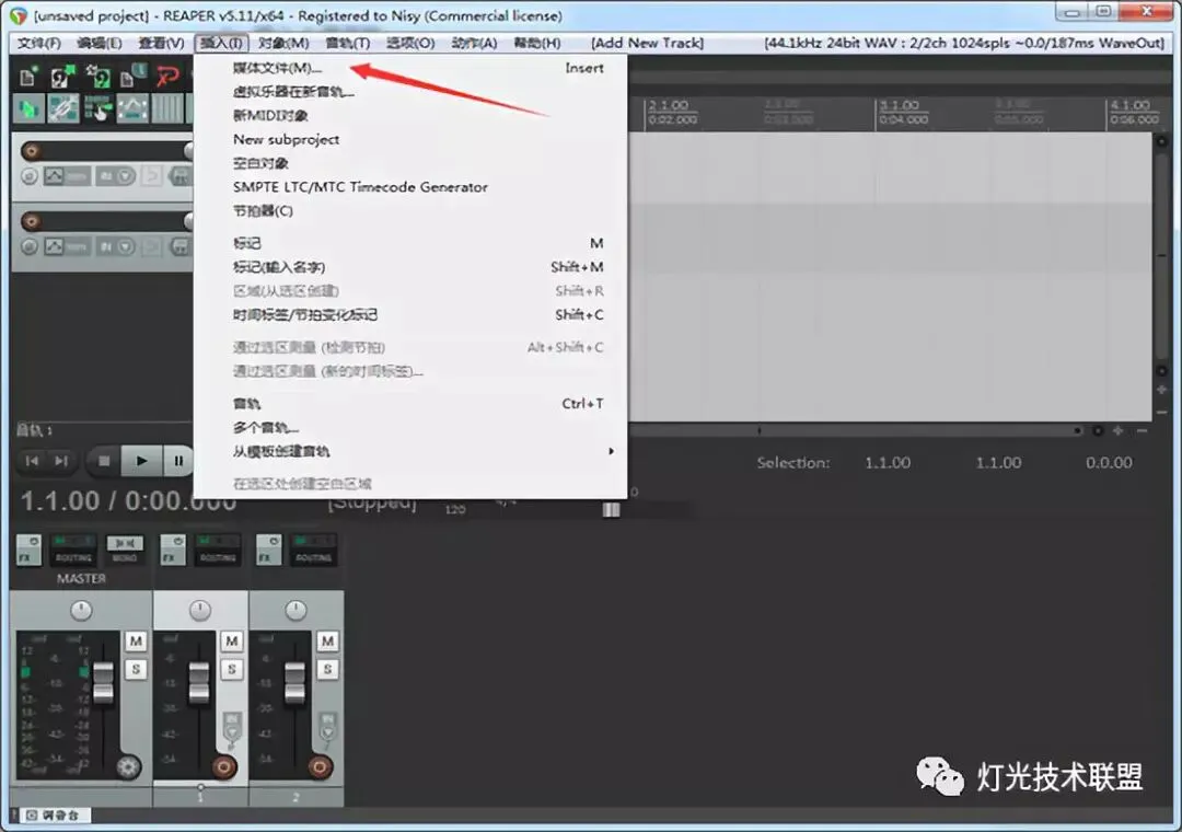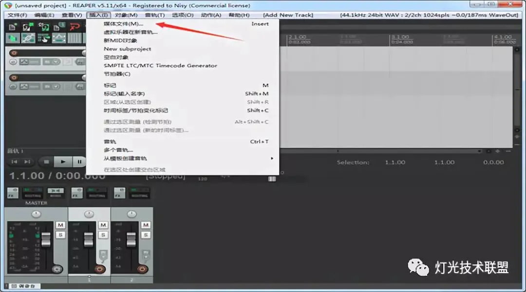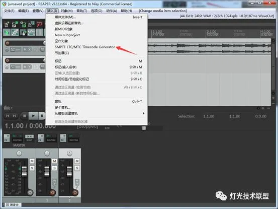 3.在第二道音轨插入时间码,点击插入,选择SMPTE LTC/MTC timecode Generator