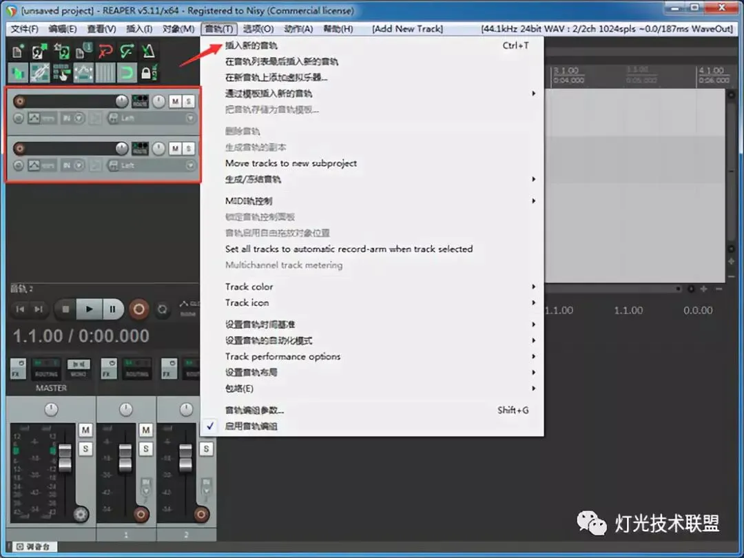1.在软件打开后,点击音轨,插入新的音轨,插入2道音轨