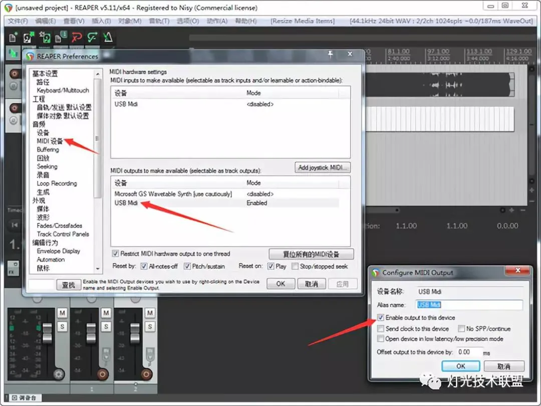 6.点击MIDI设备,双击USBMidi,勾选Enableoutputtothisdevice, 按OK确定