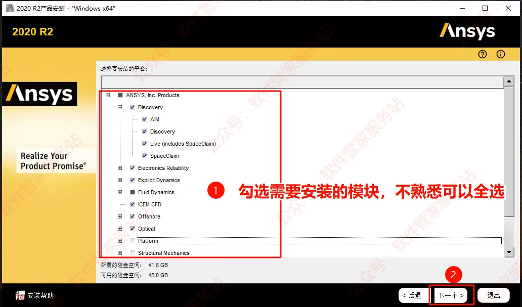 第九步:勾选要安装的平台组件(建议全选),然后点点【下一个】。