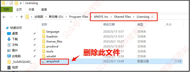 第二十七步:打开D盘的目录:D:\Program Files\ANSYS Inc\Shared Files\Licensing,将文件夹下的【ansyslmd】删掉。(注:文件目录,根据自己安装时选择的目录为准,小白请抄作业。)
