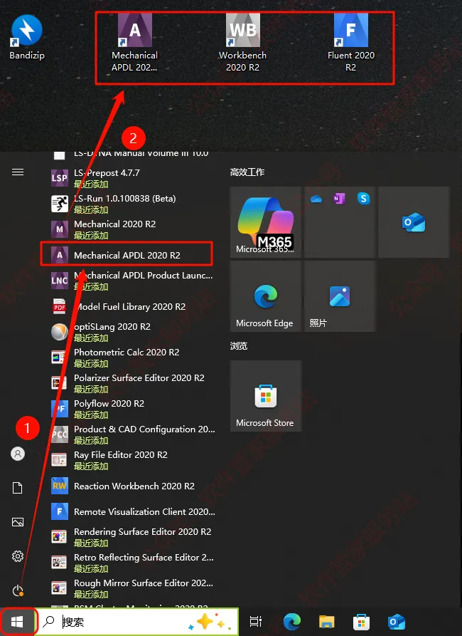 第二十八步:点击电脑桌面【开始】菜单,找到【Mechanical APDL 2020 R2】图标,按住鼠标左键拖动到到电脑桌面。注:可根据自身需求,把(Workbench、Fluent)等模块图标拖到桌面。
