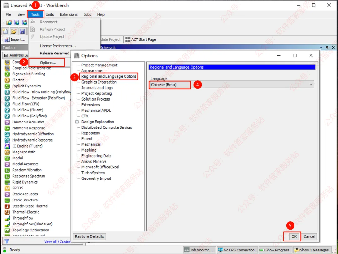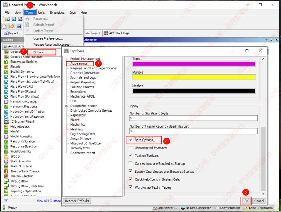 1.打开【Workbench 2020 R2】,①点击【tools】;②点击【option】;③点击【appearance】;④下拉勾选【beta option】;⑤点击【OK】。